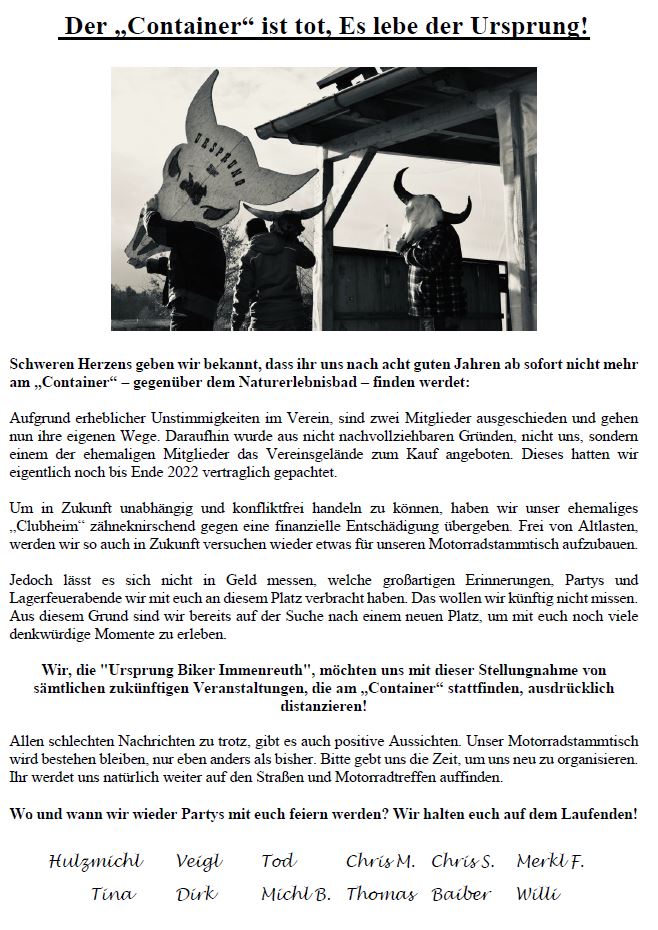 Stellungnahme, 23.02.2020! Februar 23, 2020 / Administrator News Vorheriger Beitrag After X-Mas Party 2019 Nächster Beitrag Pressebericht „Pavillon für Immenreuther Ursprung-Biker beste Lösung“